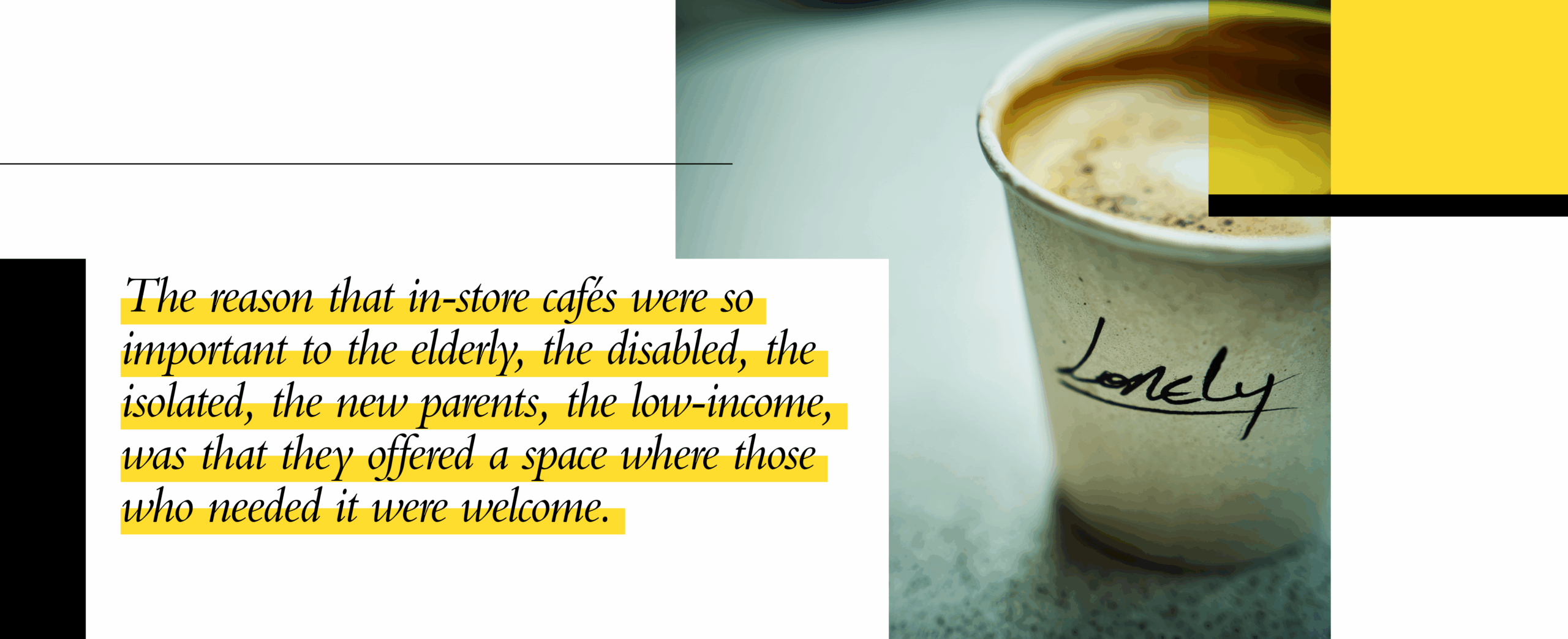 Is it unfair to assume that a big brand operator won’t fill this role? That it won’t provide the same affordability, accessibility and community? Because it was never about the coffee or food. The reason that in-store cafés are so important to the elderly, the disabled, the isolated, the new parents, the low-income, is that they offer a space where those who need it are welcome.
