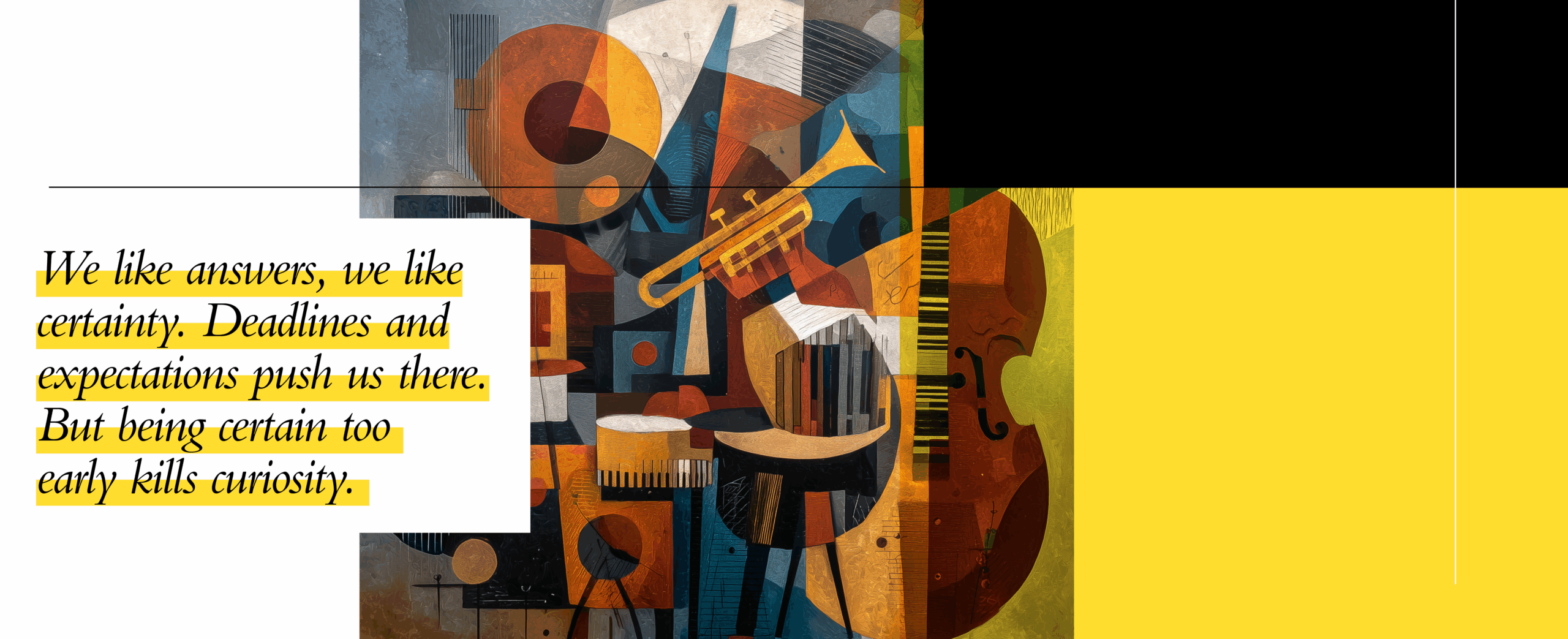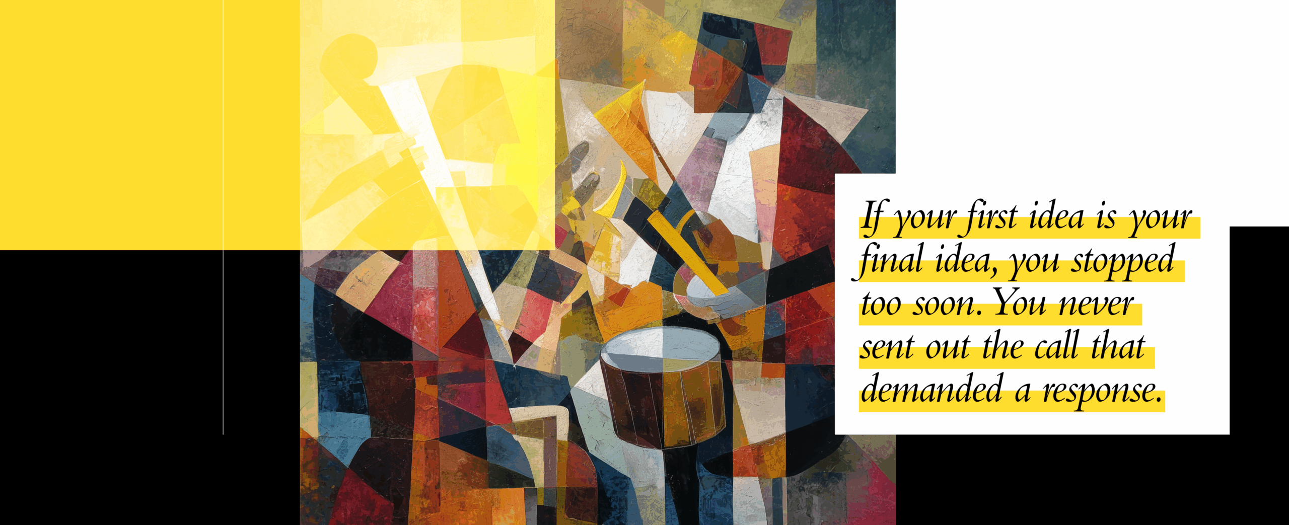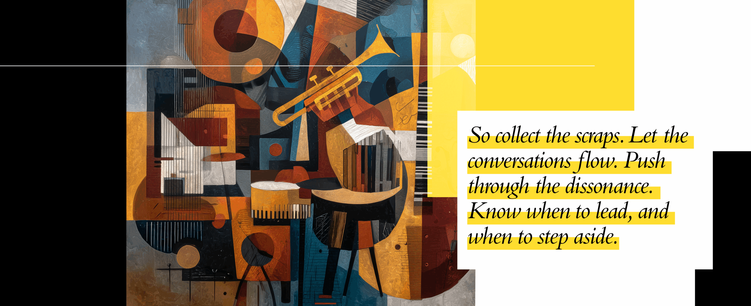 Bring that energy back into the room. Not as presentable PowerPoint slides, but as conversations and sketches on a wall. Half-formed ideas tested out loud, broken and rebuilt. That’s jazz. It looks inefficient but it saves time later, because the idea has been lived in before it’s locked down.
