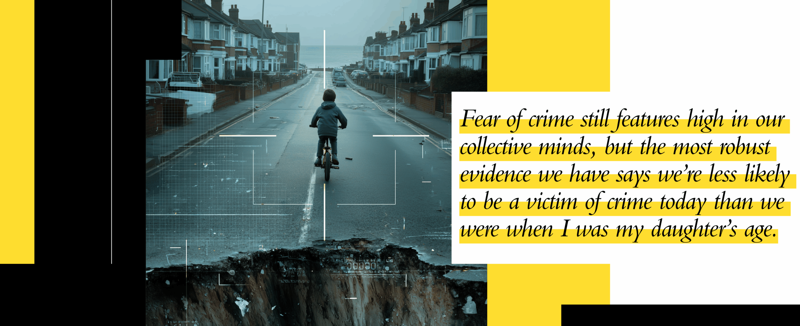 But all the evidence suggests that the worst things are happening less and less. Fear of crime still features high in our collective minds, but the most robust evidence we have says we’re less likely to be a victim of crime today than we were when I was my daughter’s age.