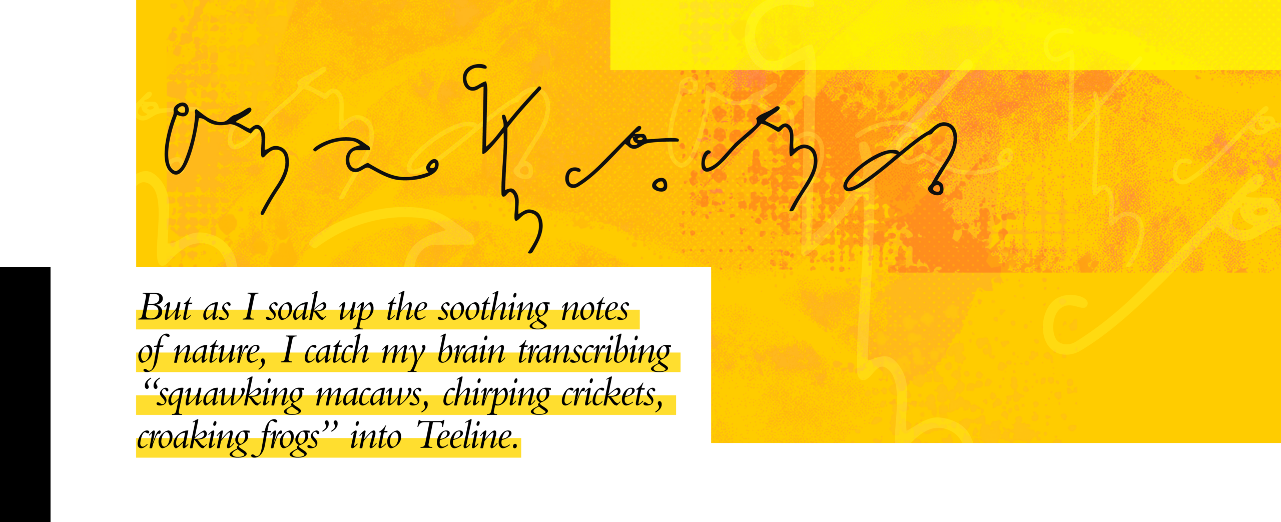 I can’t listen to lyrics while I work. So, my go-to Spotify playlist is ‘Sounds of the South American Rainforest’. It’s Amazon music: squawking macaws, chirping crickets, croaking frogs. But as I soak up the soothing notes of nature, I catch my brain transcribing “squawking macaws, chirping crickets, croaking frogs” into Teeline: