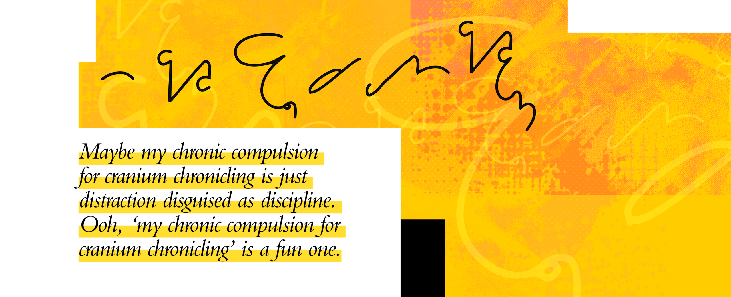 Maybe my chronic compulsion for cranium chronicling is just distraction disguised as discipline. Ooh, ‘my chronic compulsion for cranium chronicling’ is a fun one: